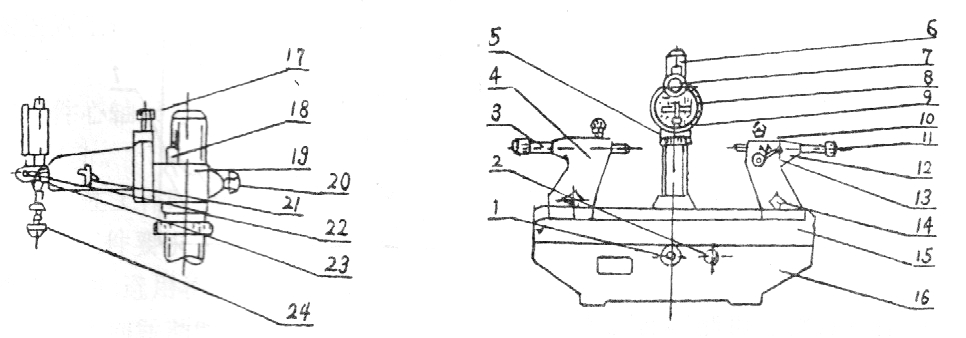 18.指標(biāo)塊 19.測(cè)量座 20.膠木螺釘 21.手柄 22.螺釘 23.表架 24.接頭